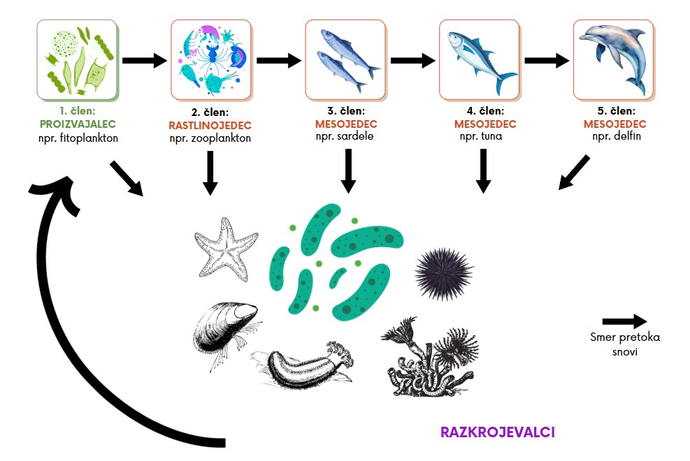 O prehranjevalni verigi in prehranjevalnih spletih smo že pisali, več si lahko prebereš tukaj (vstavi povezavo, do prispevka). Omenili smo, da se vsaka prehranjevalna veriga prične s proizvajalci in nadaljuje s potrošniki različnih redov (rastlinojedci, mesojedci in vsejedci). Preko prehranjevalnih verig in spletov se med različnimi členi preko prehranjevanja pretakajo snovi in energija, pri čemer se pojavi vprašanje? Od kod pride v zemljo dovolj mineralov in ostalih anorganskih snovi, ki jih proizvajalci kot so rastline potrebujejo zato, da lahko izdelajo organske snovi za svoje potrebe in potrebe potrošnikov.